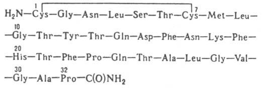 (мол. м. 3,6 тыс.; букв. обозначения см. в ст. Аминокислоты). Видовые различия в строении кальцитонин значительны (напр., кальцитонин человека отличается от свиного расположением 18 аминокислотных остатков). У разных организмов отличаются главным образом участки между аминокислотными остатками в положениях 10 и 32. Однако кальцитонин разл. видов сохраняют общую схему строения - имеют на N-конце дисульфидный мостик, связывающий остатки цистеина в положениях 1 и 7, и остаток амида пролина на С-конце. Для проявления биол. действия кальцитонин обязательно сохранение всей его пептидной цепи. Осуществлен хим. синтез кальцитонин человека и ряда животных.