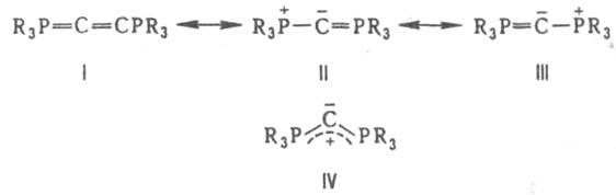 КАРБОДИФОСФОРАНЫ [бис-(фосфоранилиден)метаны], соед. общей ф-лы R3P=C=PR3, где R = Ph, Alk, Cl. Угол РСР меньше 180° и в некоторых соед. составляет 120°. Особенности электронного строения карбодифосфораны отражают резонансные структуры I-III или ф-ла IV с делокализованными связями: