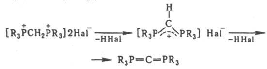 Общий метод синтеза карбодифосфораны - дегидрогалогенирование дифосфониевых солей; первую стадию этой реакции осуществляют,