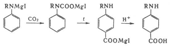 карбоксилирование магнийпроизводных орг. аминов приводит к n-аминобензойным кислотам: