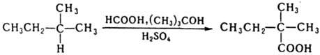 Общий метод карбоксилирование насыщ. углеводородов. содержащих Н при третичном атоме С, - введение карбоксильной группы путем замещения атома водорода. Осуществляется обычно действием смеси муравьиной и серной кислот в mpeт-бутаноле, например: