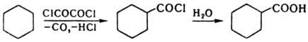 Введение карбоксильной группы в насыщенные или ароматич. углеводороды осуществляется также действием оксалилхлорида, например: