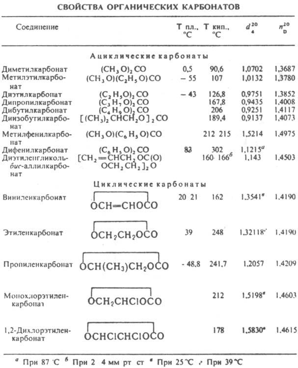 КАРБОНАТЫ ОРГАНИЧЕСКИЕ, сложные эфиры угольной кислоты. Средние ациклич. карбонаты (К.) бесцв. жидкости с эфирным запахом (см. табл.); не раств. или трудно раств. в воде. этаноле. диэтиламине. аммиаке. раств. в эфире, ацетоне. бутиламине. бензиламине. образуют