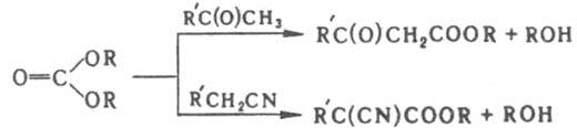 По хим. свойствам К. - типичные эфиры сложные. Ациклич. К. в присутствии кислот Льюиса алкилируют ароматич. углеводороды, с хлорбензолом при действии Na образуют трифенилкарбинол. реагируют с ацетиленом с образованием эфиров алкоксикарбоновых кислот. Нуклеофилы расщепляют их по связи С(О)—О, например, при взаимод. с NH3 образуются уретаны NH2C(O)OR. Ациклич. К. используют для алкоксикарбонилирования по Клайзену: