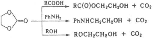 Исключение реакция с NH3 или алифатич. аминами. приводящая к R2NC(O)OCH2CH2OH; виниленкарбонат в этой реакции образует R2NC(O)OCH2CHO. Каталитич. гидрирование циклич. К. приводит к 1,2-гликолям и метанолу Диеновым