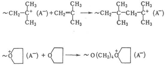 соед.-как правило, ониевые (оксониевые, аммониевые, сульфониевые и т. п.). Акт роста цепи при Катионная полимеризация ненасыщенных соед. происходит по типу присоединения, в случае гетероциклич. соед. - по типу замещения. Напр.: