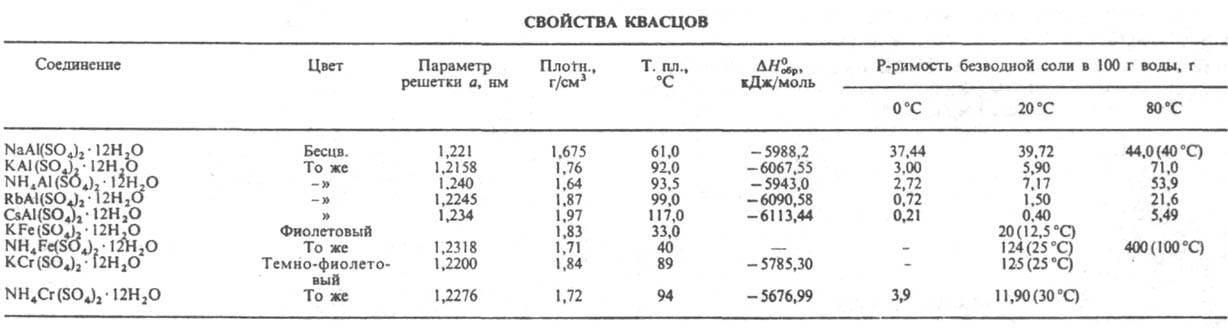 Известно несколько десятков различных квасцов. Способность к образованию квасцов, их устойчивость возрастают по мере увеличения радиуса М+ и уменьшения радиуса М3+ (при сходной внеш. электронной оболочке). При этом более сильное влияние на свойства квасцов оказывает природа М+ . Так, алюмолитиевые квасцы, в отличие от алюминиевых квасцов с более крупными катионами (Na+, К+ и др.), при температуре 20-25°С не образуются, а могут быть получены лишь при температуре около -2°С. Катион А13+ (ионный радиус 0,057 нм) дает квасцы с Li+, Na+ , К+ , NH+4, Rb+, Cs+, в то время как In3+ (0,092 нм) - только с Cs+, Rb+ и NH4 в виде метастабильных фаз. У квасцов, содержащих один и тот же катион М3+ , в ряду Na, К, NH4, Rb, Cs растворимость в воде падает, а температура плавления и их термическая устойчивость увеличиваются (см. табл.). Квасцы легко выделяются из водных растворов в виде больших октаэдрических кристаллов с кубической решеткой (z = 4, пространств, группа РаЗ). Известны три структурные разновидности квасцов - α, β и γ, отличающиеся друг от друга ориентацией тетраэдров SO4 по отношению к М+ и некоторыми другими признаками. Эти различия обусловлены размером однозарядного катиона. β-Квасцы содержат относительно большие катионы (Cs+, CH3NH3+), α-катионы меньшего размера (К+, Rb+), единственный представитель γ-квасцы NaAl(SO4)2.12H2O. В кристаллических структурах всех квасцов катионы М3+ и М+ координируют по 6 молекул воды. В β-квасцах в координационную сферу М+ входят также 6 атомовкислородаанионов SO2-4. α- И β-квасцы образуют твердые растворы между собой, γ-квасцы твердых растворов с другими квасцами не дают.