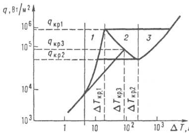 DТ=Ти—Ткиппри кипении в большом объеме свободно конвектирующей жидкости: 1 - пузырьковый режим; 2 - переходный режим, характеризуемый сменой пузырьковой структуры на поверхности нагрева сплошным паровым слоем (пленкой), от которого отрываются крупные паровые пузыри; 3 - пленочный режим, при котором происходит также радиационная теплоотдача от поверхности нагрева к жидкости через паровой слой; прямая линия характеризует третий кризис кипения, где qкр,10 - плотность теплового потока при v=0, rп - отношение плотностей пара и жидкости, К=r/Cpv - тепловой критерий фазового перехода, Ср - массовая теплоемкость жидкости, ДжДкг.К).