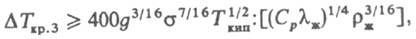 При низких давлениях возможен третий кризис кипения в форме непосредственного перехода от режима конвективного движения жидкости к развитому пленочному кипение Этот переход имеет цепной кавитационный механизм и реализуется при разностях температур на поверхности нагрева и кипение, удовлетворяющих условию: где lж и rж - соотв. теплопроводность и плотность перегретой жидкости, g - ускорение свободного падения.