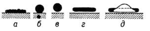 Рис. 2. Формы испарения жидкости, свободно растекающейся по горячей поверхности: а в капле, смачивающей не сильно нагретую поверхность, происходит пузырьковое кипение; б температура стенки повысилась, и капля принимает сферическую форму; в при увеличении температуры поверхности нагрева капля зависает в паровом слое; г - с возрастанием объема капля принимает форму плоского сфероида; д взвешенный в паровом слое большой сфероид, из котоpoгo пар эвакуируется через куполообразные пузыри.