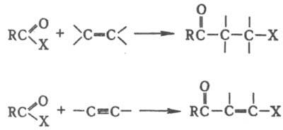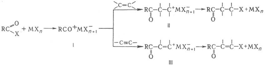 Механизм кондакова реакция включает генерирование высокореакционноспособного ацилиевого комплекса I (МХn - кислота Льюиса), который взаимод. с олефином с образованием карбкатионов II или III.