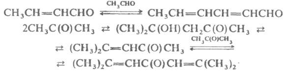 Первая стадия процесса - синтез альдоля (см. Альдольная конденсация), который обычно при комнатной температуре или при нагр. дегидратируется. Кетоны реагируют в более жестких условиях, чем альдегиды. Образующееся в реакции нeнасыщ. карбонильное соед. может вступать в реакцию с исходными веществами, напр