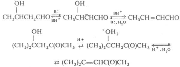 Механизм дегидратации альдоля зависит от природы катализатора (основания или кислоты), например: