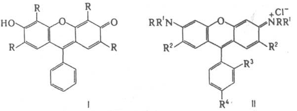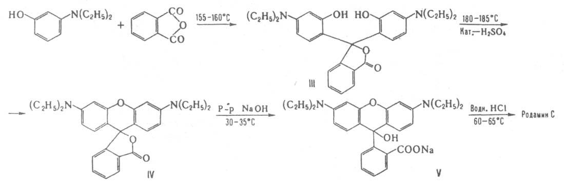 Родамин С (II; R = R1=C2H5, R2=R4=Н, R3=СООH) - ярко-красный с синим оттенком краситель. Его синтез (как и синтез гидроксиксантеновых красителей) протекает ступенчато через стадии образования диаминодигидрокситриарилметанового красителя (III), бесцв. лактона (IV) и бесцв. карбинольного соед. (V) по схеме: