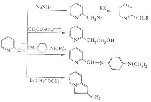 пиколины по хим. свойствам подобны пиридину. с сильными кислотами и алкилгалогенидами образуют соли, надуксусной кислотой легко окисляются в N-оксиды, восстанавливаются водородом (кат. - Pt) или Na в спиртах в производные пиперидина. Под действием KMnO4, HNO3 и O2воздуха в присутствии V2O5 a-, b- и g-пиколины окисляются соотв. до пиколиновой, никотиновой и изоникотиновой кислот; окислит. аммонолизпиколины приводит к нитрилам этих кислот, окисление в присутствии SeO2 - к соответствующим альдегидам. В отличие от b-пиколины a- и g-пиколины могут подвергаться дейтерообмену по атомам водорода группы CH3, при действии NaNH2 и C6H5Li образовывать ме-таллоорг. производные, взаимод. которых с алкилгалогенидами приводит к гомологам пиридина, конденсироваться с альдегидам., кетонами. нитрозопроизводными и др. соед., например: