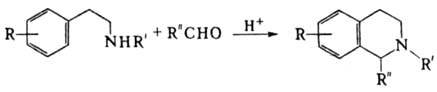 Сходные по механизму реакции осуществляются с участием N-ацилиминиевых ионов (ф-ла I), которые генерируются из разл. предшественников. По сравнению с иминиевыми интермедиа-тами, образующимися в П.-Ш.р., ацилиминиевые ионы более электрофильны, что позволяет проводить реакции с их участием в более мягких условиях. С помощью такого метода, родственного П.-Ш.р., синтезированы конденсир. гетероциклы (в т.ч. некоторые лек. ср-ва и алкалоиды), включающие фрагмент тетрагидроизохинолина, например: