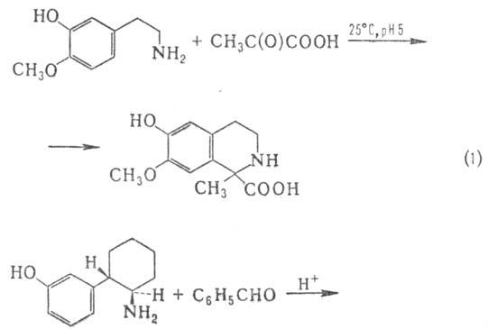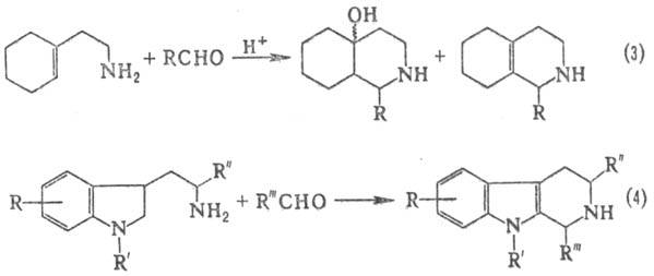 В условиях П.-Ш.р. из 1-(2-аминоэтил)циклогексена образуется дека- и октагидроизохинолины (3), из триптамина или триптофана и их производных-разл. тетрагидрокарбо-лины (4), многие из которых образуются в мягких условиях с высоким выходом:
