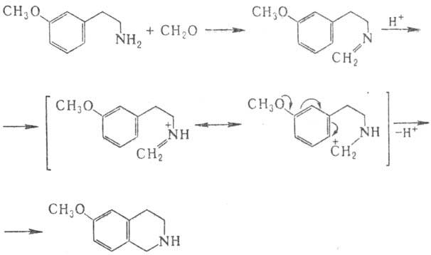 П.-Ш.р., по существу, является внутримол. реакцией Ман-ниха и протекает по механизму электроф. замещения в ароматич. кольце. Образующееся из фенилэтиламина и карбонильной компоненты основание Шиффа, которое иногда можно выделить, циклизуется после протонирования в тстра-гидроизохинолин, причем электронодонорные заместители облегчают реакцию: